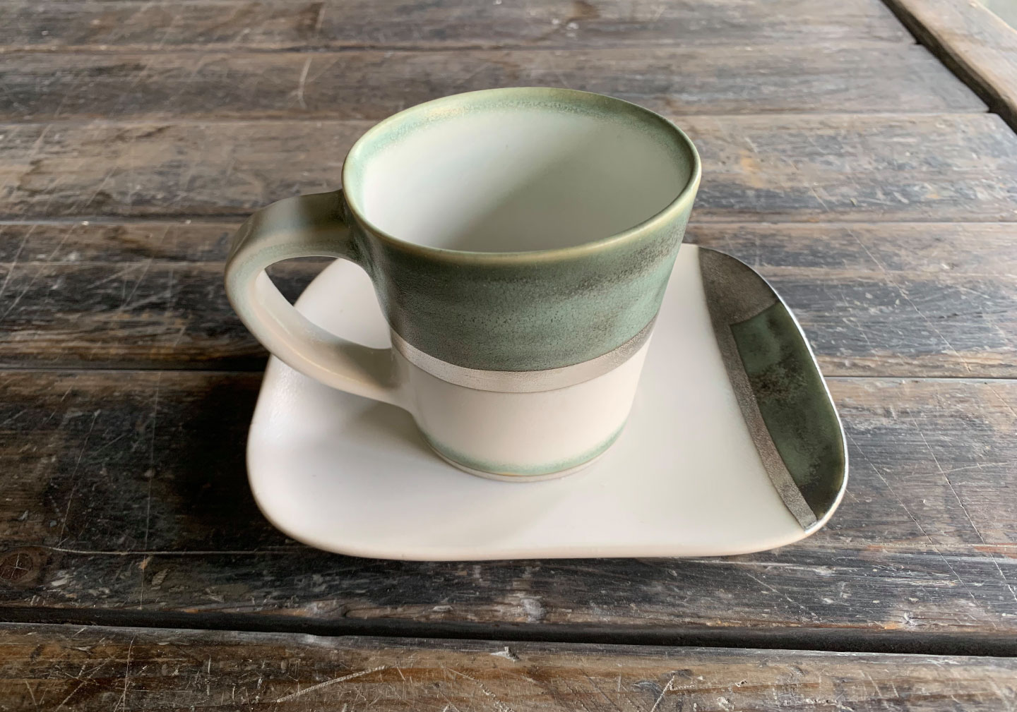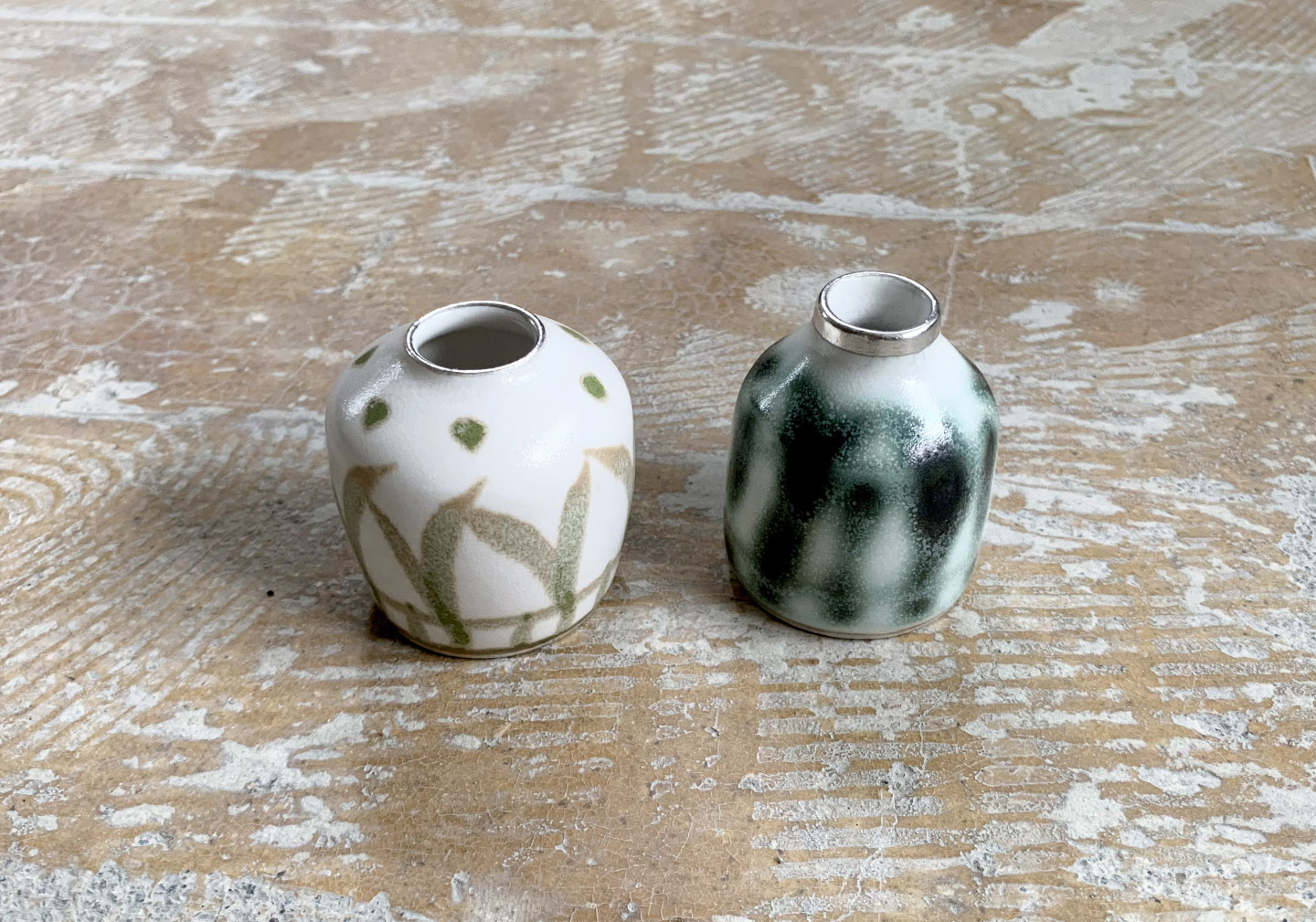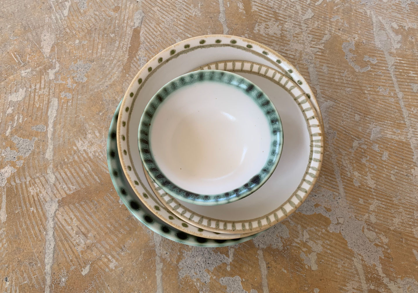 ベースの白い錫釉をかけた後、同じ釉薬に酸化金属を混ぜたもので加筆する技法です。 酸化銅、酸化ニッケルなどを使用しています。 銅(濃い緑に発色します)は窯の中で揮発するため、 ゆらゆらと揺らいだ様子がそのままグラデーションとして美しく残ります。 ニッケルは優しい草色になります。