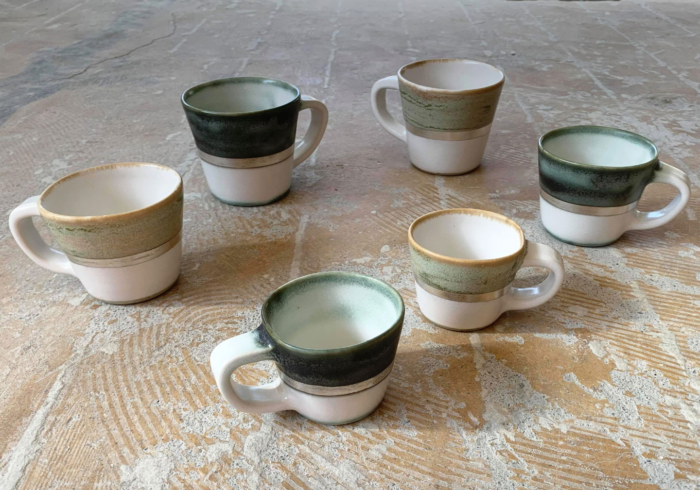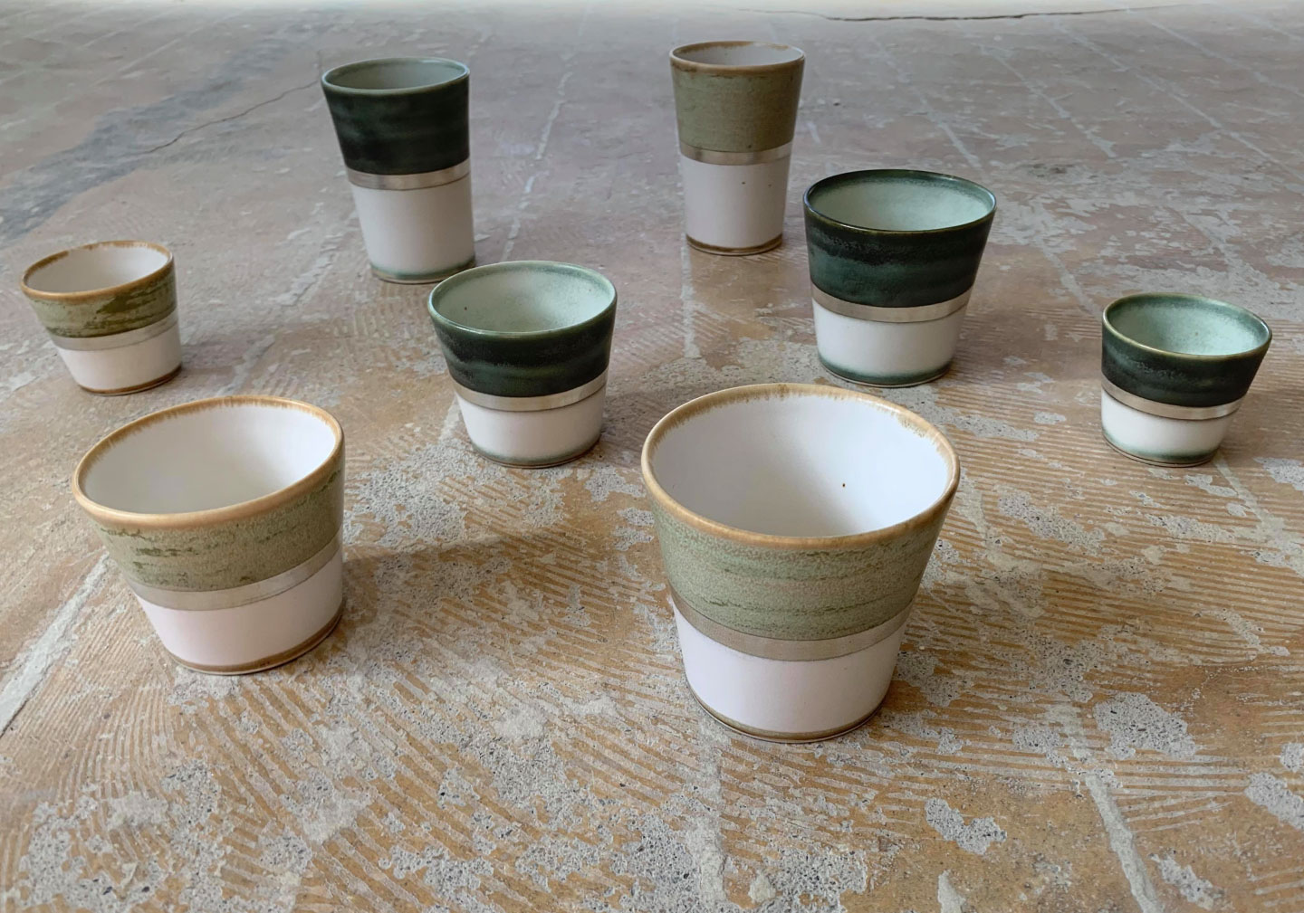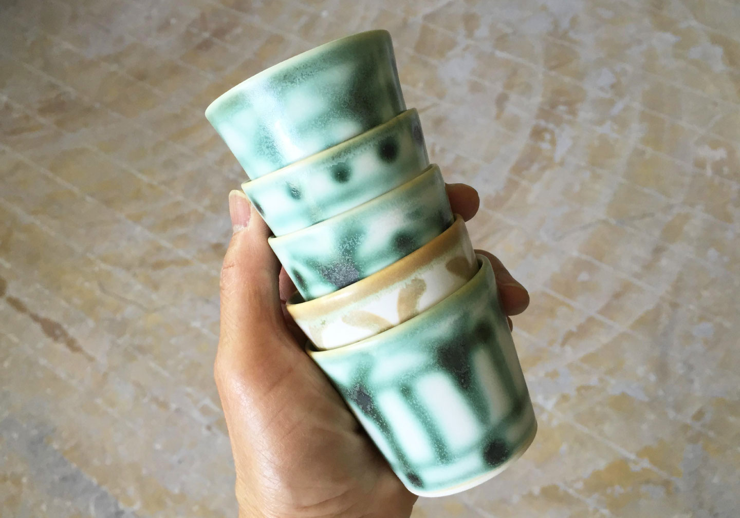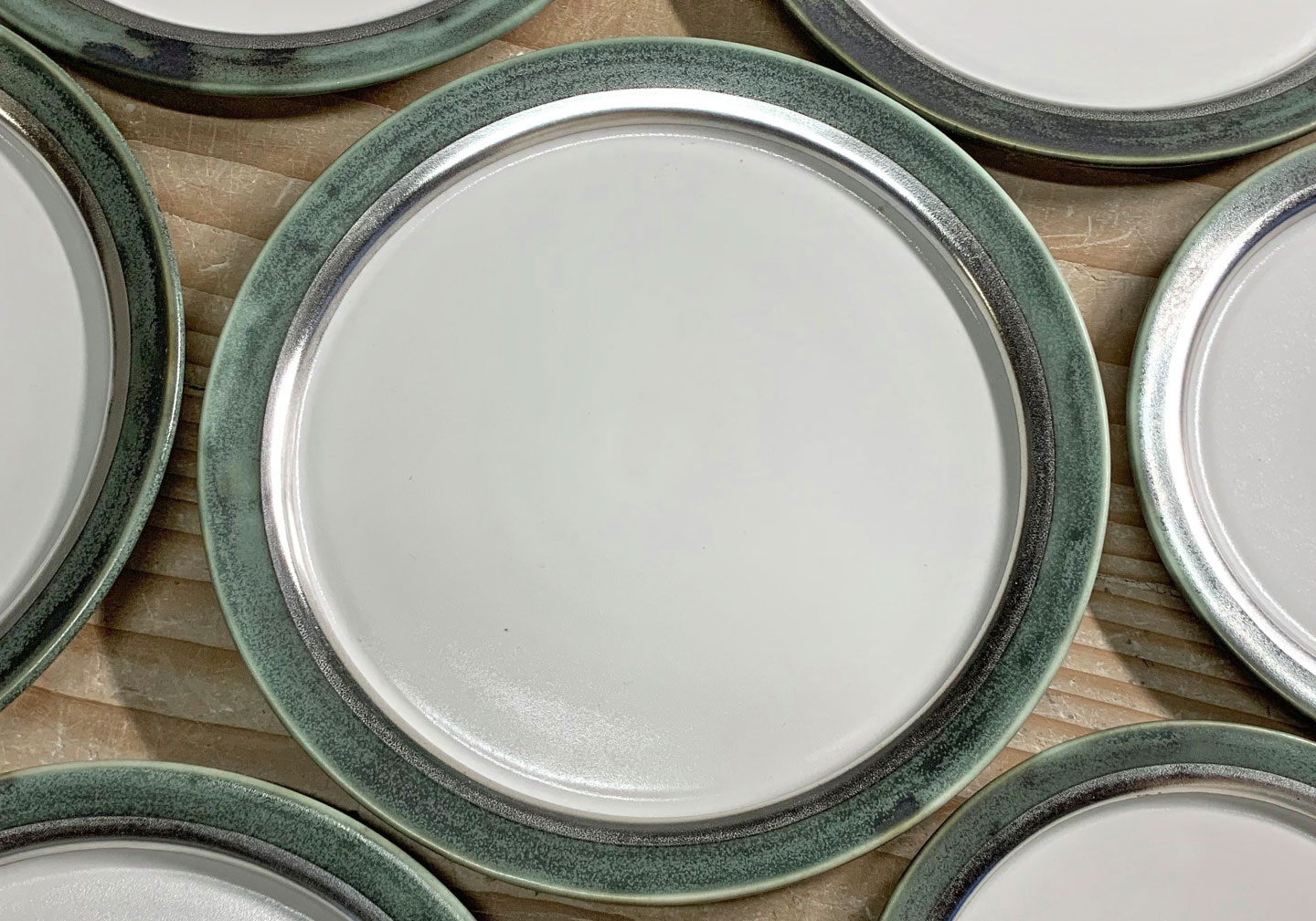 ベースの白い錫釉をかけた後、同じ釉薬に酸化金属を混ぜたもので加筆する技法です。 酸化銅、酸化ニッケルなどを使用しています。 銅(濃い緑に発色します)は窯の中で揮発するため、 ゆらゆらと揺らいだ様子がそのままグラデーションとして美しく残ります。 ニッケルは優しい草色になります。